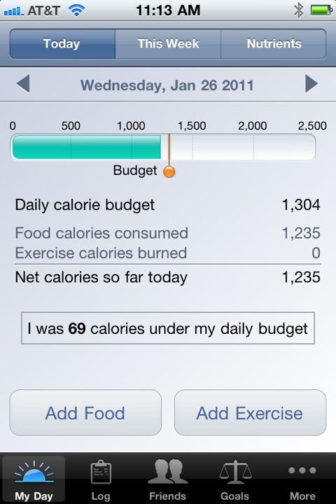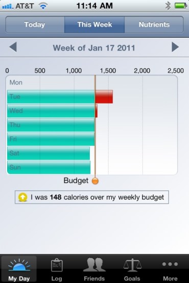 A graph of calories consumed for the week, keeping in mind your daily budget. It also tells you how much you were over or under your entire weekly budget. it is ok to be over a little bit on one day, if you make up for it another day.