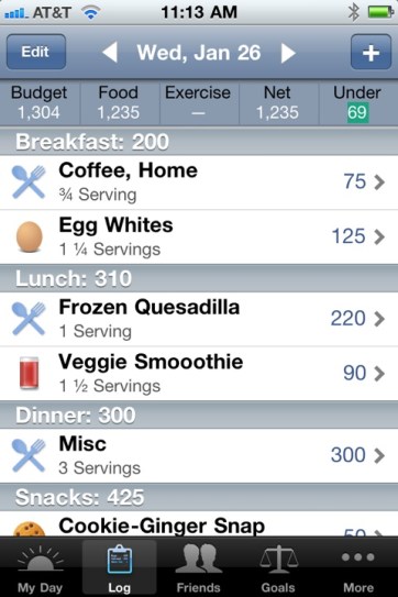 Ok, for all you people out there that say you don’t know why you can’t lose weight, this app is for you. A couple of years ago, my good friend SS made me realize that losing weight is just MATH. Calories IN have to be less than calories OUT. So that means that you have calculate how many calories you burn in a day – this depends on your current weight, height, age and gender. Then, you have keep track of exactly how many calories you eat in the day (yes, even those small little snacks or treats) and how many calories you burn every day. Well, some of the hardest parts of that are 1)having an easily accessible place to put all of that information, 2) calculating it all 3) figuring out how many calories are in everything etc. BUT if you do this, it really works!! You don’t even have to do any exercise, you just have to adjust how much you eat – i.e. your total calorie consumption has to be lower. So, i took her advice, used the notes function on my phone to track everything, and lost exactly what my goal was, which was about a pound a week – that is a healthy amount of weight to lose that is reasonable to be able to keep off. Then I got pregnant…now here I am, wanting to lose another 15 pounds. Luckily, in the interim, I have found this awesome app called “Lose it!” You enter in what your age, weight and height is, and what your goal weight is. Then it gives you options for rate of weight loss (i.e. 1 pound a week) and then it calculates what your daily NET calorie consumption should be. YOu can then use the app to track what you eat every day, find common foods with their caloric amounts, or enter your own foods and how many calories they have (which it saves for use again later) and you can also enter any exercise yo do for calories burned. You have to get into the habit of looking at the calories in EVERYTHING you eat, and measuring how much you are eating (it is really easy to eat 2-3 servings of cereal and think you are only eating 1). You can periodically enter your weight, and it will give you graphical representations of your weight loss and how that compares to your goal. I LOVE it. Check it out – here are some screen shots: