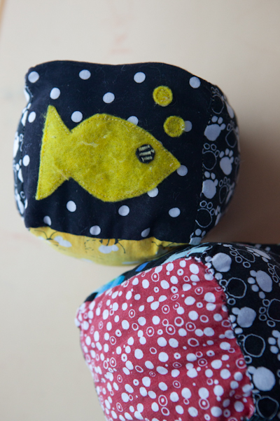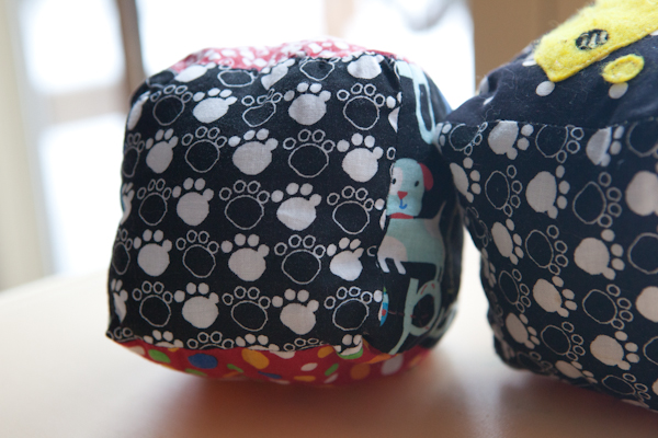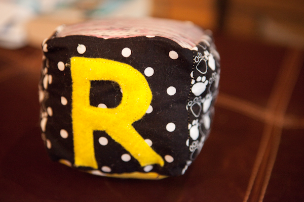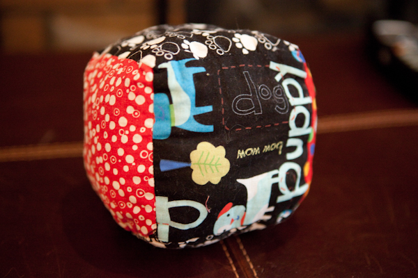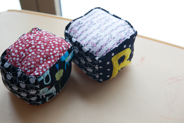 Basically you first sew 4 sides together, with right sides facing together (that is the easiest part). Then you sew the top and bottom on. The corners are the trickiest part, and basically what I did was get to the corner, then lift the pressor foot with the needle still in the fabric, and twist the layers of fabric so I could go in another direction without twisting the fabric into the seam. Worked pretty well! And then the last small seam I sewed by hand after putting in the stuffing. I also put little rattles into the cubes by finding something small and hard, putting some jingle bells or rice or lentils into it, and sticking it in the middle of the cube. That extra sound goes a long way with the kids!