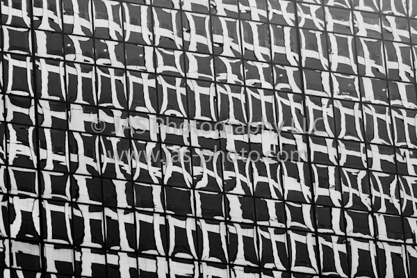 This is the kimmel center in downtown Philadelphia. The pictures is actually of glass – the vertical lines are the metal cords holding up the glass, and the slanted lines are the roof of the structure showing through the glass.