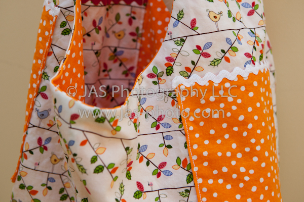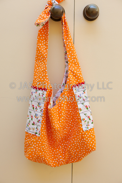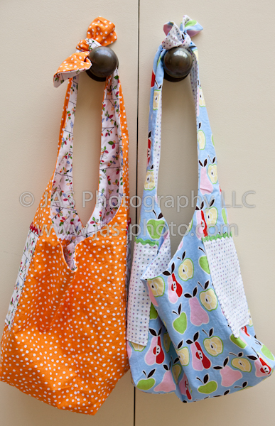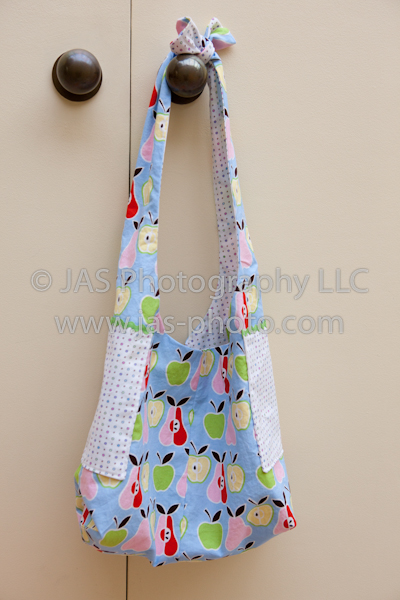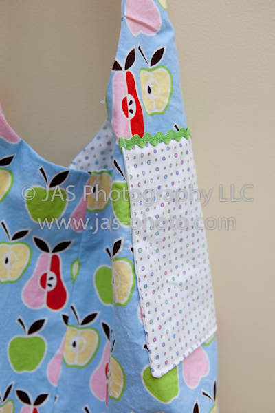 So these are my results! I didn’t start off planning on making two right away. But I realized that the two fabrics I originally picked (the apples and the orange polka dots) really didn’t look right together. So I cut two more pieces of fabric, and made two bags – which I am totally happy with. One is a more calm, subtle, relaxed bag with light colors, while the other is more bright, and OPEN YOUR EYES colors!