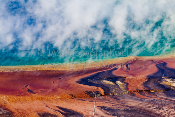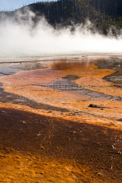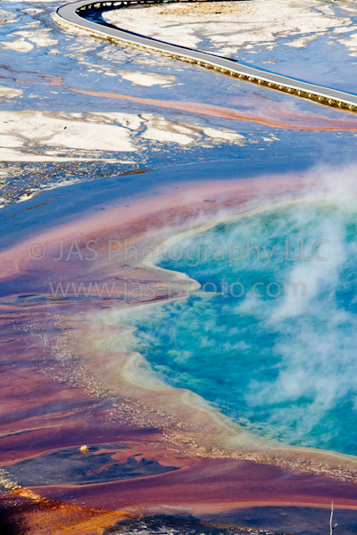 These next few images might be the best examples of perspective. When we went to Yellowstone, we kept seeing pictures everywhere of Grand Prismatic spring and all of its rainbow of colors. Well, we get there, and the BELOW image is what we see. Where were the colors??? All I could see was orange and smoke. Granted, it was still beautiful, but I had my heart set on seeing the grand picture that I had been enticed with. The spring was actually hidden behind all the smoke because it’s water was boiling hot and the air outside was cold. So….we drove to that hill you see in the background of the shot, and climbed. Not sure if we were “allowed” to, but we did.