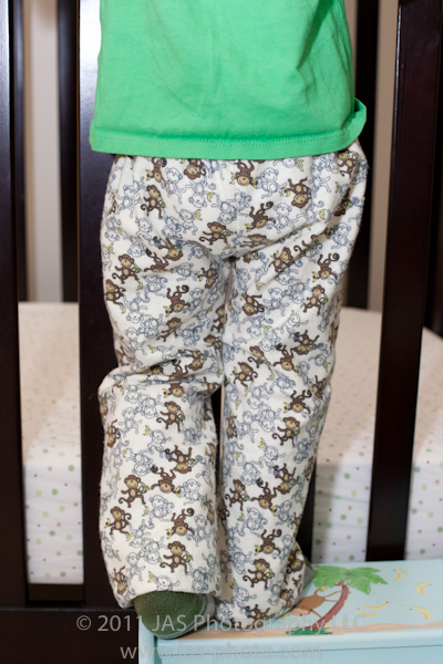 These are the first pair of pants I have ever made… I used instructions from Dana-Made-It on how to make your own pattern using existing pajamas, but forgot to leave enough space at the top for an elastic casing. So I did something I hadn’t done before – sewed the elastic directly onto the pants – you know, using a ball point needle and stretching the elastic as I went. I always enjoy learning and trying new techniques – so it was fun! They are by NO means perfect fitting, but they work and withstood a full day of playing!