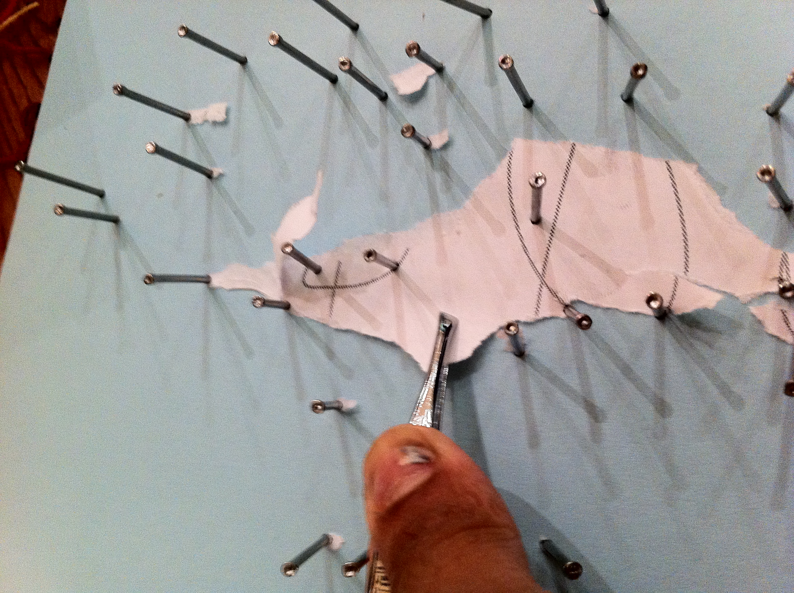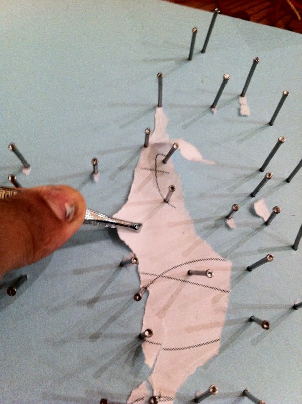 7. Removed the white printer paper – since I was nailing to corrugated cardboard which is not that tough, I made sure to hold the nails in place while I pulled the paper off.  I had to get tweezers to remove all the paper from the middle parts of the wards and the small pieces left around  the nails
