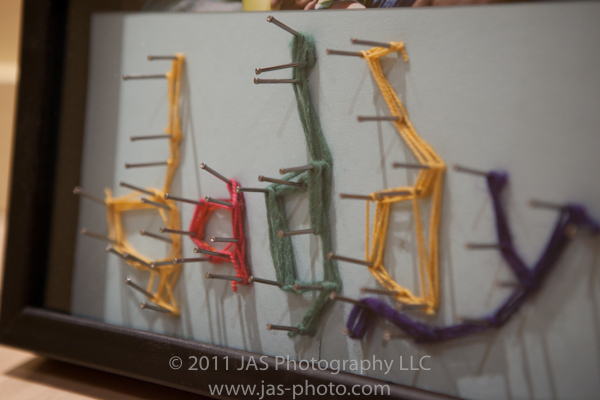 Anyways, I hurriedly tried to put something together for him using this idea and this is what I came up with! It is far from perfect because i didn’t have time to go to the hardware store to buy wood to nail the nails into. I went to AC Moore to get the shadow box frame and was hoping to find something hard there to use – but didn’t find anything the right size. So I found some corrugated cardboard laying around my house (no joke) and used that instead. it is FAR from sturdy, but I figure – it is in a frame and will be on a wall…hopefully it will be fine! This is my problem: when I want to do a project, I want to do it RIGHT NOW. Even if I don’t have all the proper supplies, tools…or even TIME (which is why many of the get done in the middle of the night with less than all the necessary equipment).