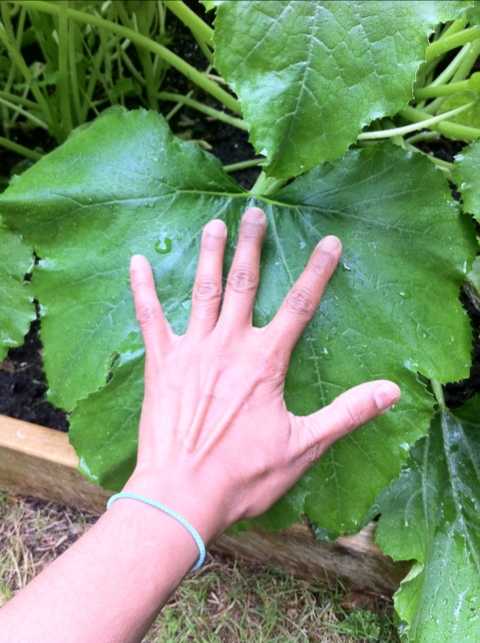 our HUGE zucchini leaves! I definitely underestimated how big these plants would get (that’s what I get for not heeding my mother-in-law’s warnings!). So now they are taking over. We even had to move the japanese eggplants that were next to them because they were being completely covered by the leaves and getting no sun! I need to buy a trellis to keep them away from the other plants..hopefully tomorrow!