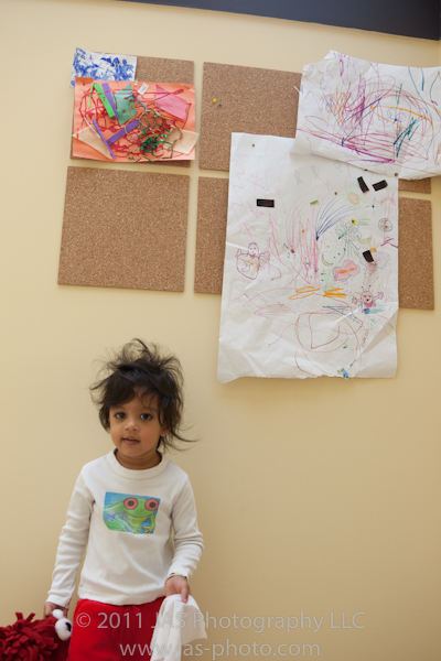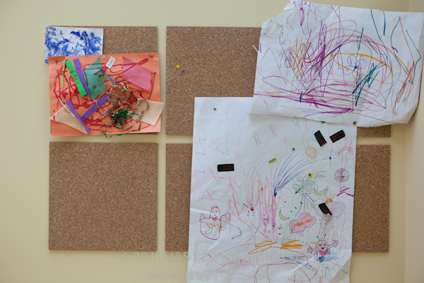 The fun part is that I put it up right outside of her room, so that every day when we walk by, we can see it. And she can understand how important her art is to us and how much we treasure it! Unlike the picture above, you can’t even see the cork boards now because I have so much stuff up on them. But in order to keep up with her newer pieces, I basically take one down to put one up. Works pretty well!