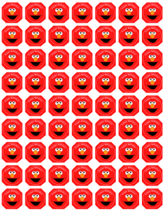 They are 1 inch circles, red with elmo’s face.  Print them on an 8.5 x 11 page or LABEL paper (you can buy this at any office supply store, or buy in bulk from planetlabel.com), and then use a 1 inch circle or scalloped circle punch to punch out your toppers.  Then stick a toothpick to the back of one sticker, and put another sticker behind it.  And viola! You have your very own DIY Elmo cupcake topper! Yay!