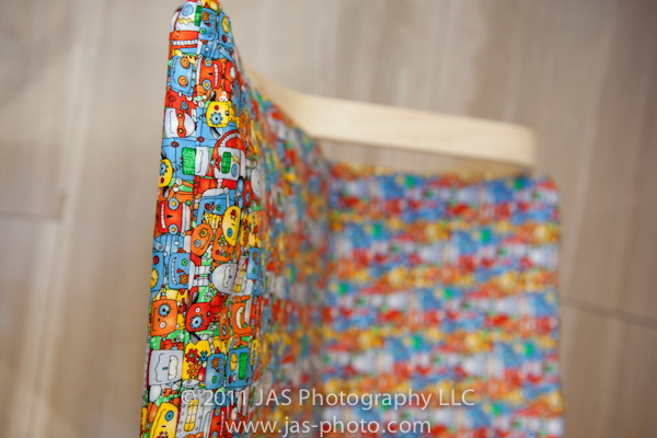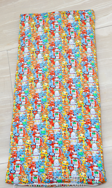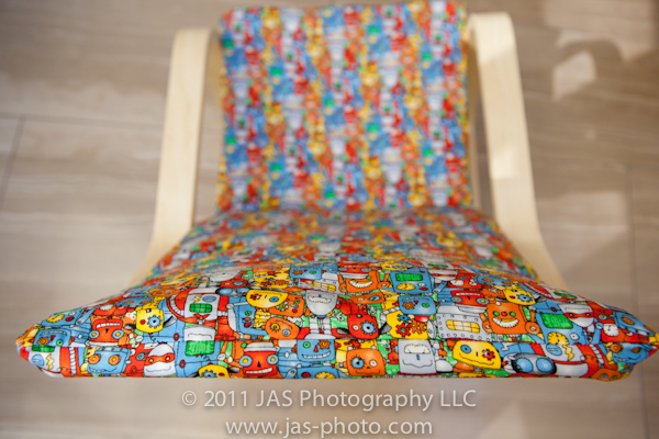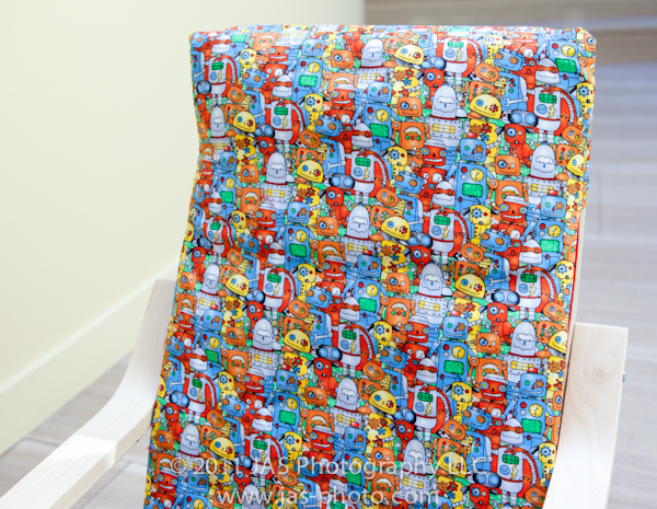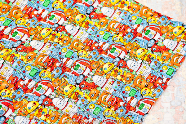 Alright, so start with figuring out what fabric you want to use.  You need a front and back fabric, but the back fabric is essentially not seen once the cushion is on the chair.  I went with this super cute robot fabric which is 100% cotton and kind of thicker than normal, so that it would stand up to some rough play.