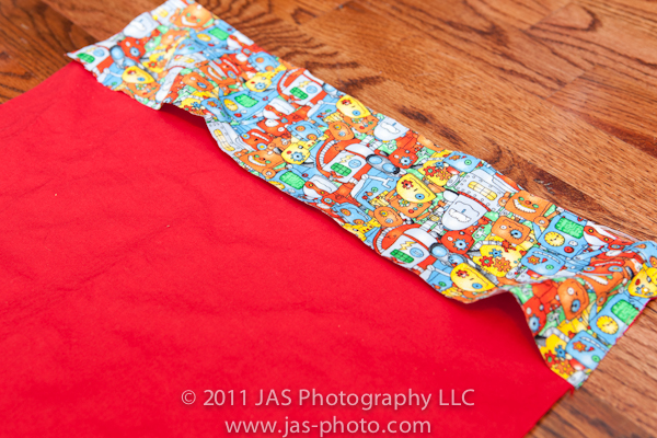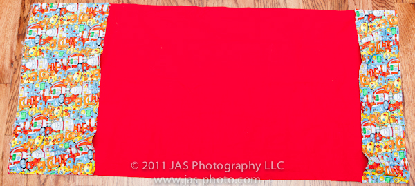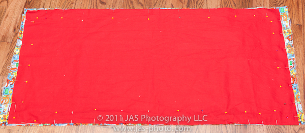 Note: unlike in my picture below, your fabric will all match up – my front piece is too big, which is why it is sticking out from the edges of the rest of my fabric.