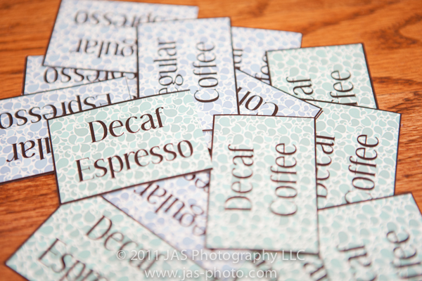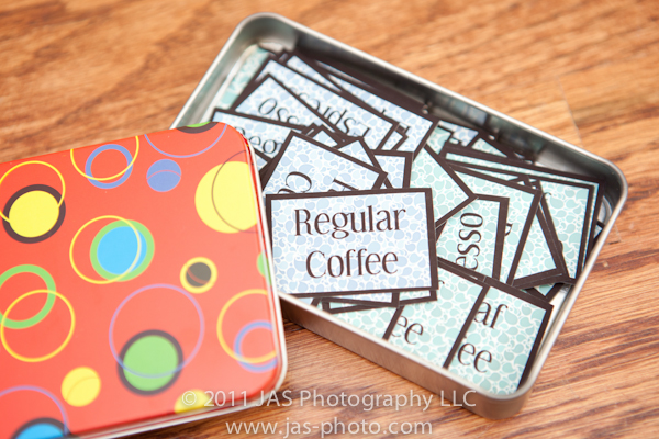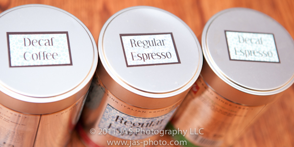 SOOO….I made some cute coffee labels to put on my different containers so that I can keep track! I made labels in 2 different sizes – small ones for the top, and larger ones for the sides.