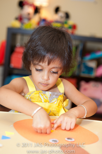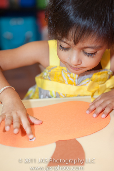 She had lots of fun putting the foam stickies on the backs of the eyes and then putting the eyes on the pumpkins.  Although it was a little challenging for me to control my “Type A-ness” and let her just do whatever she wanted, it ended up being lots of fun!