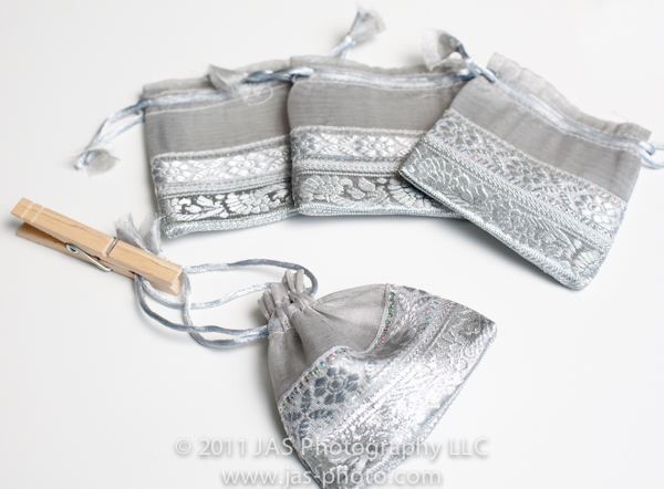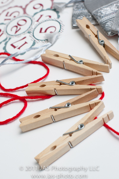 Yarn, clothespins, cute silver bags, and printed numbers.