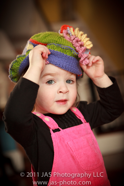 So finally I came up with the idea of trying to play games with her to get her to have fun and relax in front of the camera. She had a new hat that her grandma made for her and that she loved, so we decided to play peek-a-boo with the hat!