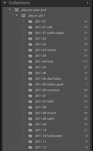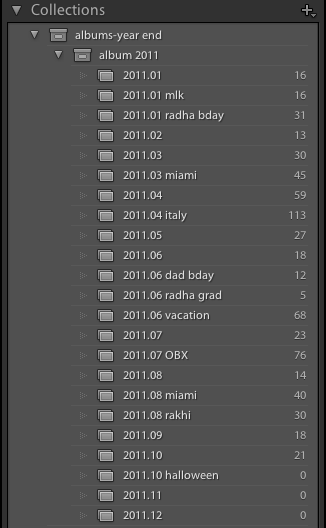 1) I am making a collection SET in Lightroom for my year end albums, and then collections within that for each month and significant event.