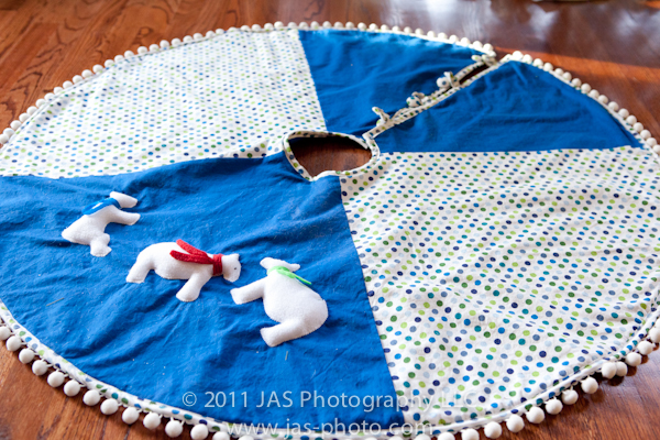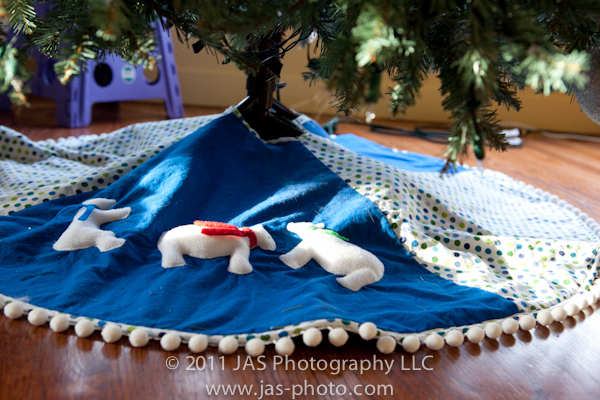 So here is my finished product. I went with blue and green of course, and used my husband’s suggestion of white polar bears as a decoration piece on the skirt.