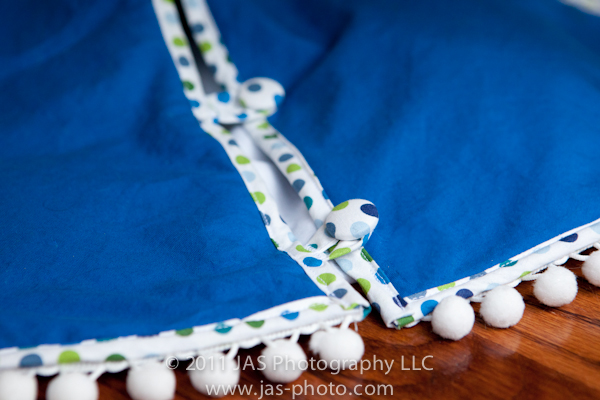 Once it was right side out, I sewed the bias tape around the outer edge and inner circle. Before sewing bias tape on in the cut seam where the buttons are, I made 4 button holes where the button straps would come out, and then sewed those in place at the same time (I used bias tape for the button straps as well).