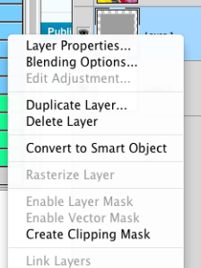 3) Once you have the picture layer above the shape layer where you want it to show up, use the clipping mask feature (right click on the layer and choose “create clipping mask” or press alt/option + command + G). To try to make this easier, I have numbered the different picture holders and matched that to the layer number.