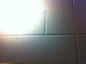 grout/cement line between painted cinderblocks