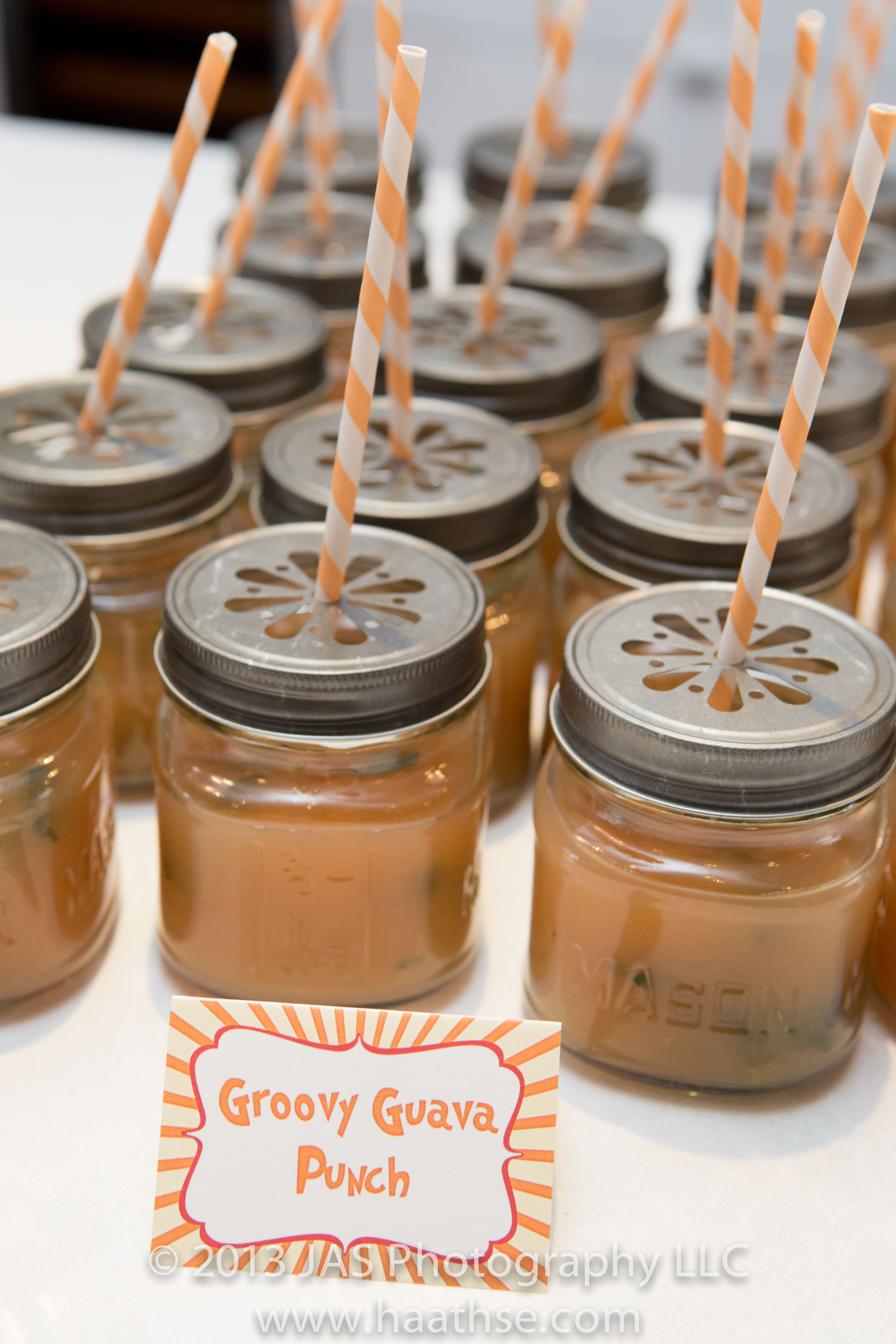 The mason jars i kinda fell in love with after I saw them a couple of times on Pinterest.  Especially the daisy cut out on the tops.  Since they are glass jars, we reserved these punch drinks for the adults.  The mason jars can be really expensive, but I found the jars and the lids separate at the following places and it was MUCH MUCH MUCH less expensive than most places you will find.  The only downside is there was no insert with the lids, so you can’t really use them as sealable jars.  That being said, you can easily buy those inserts from canning supply places!