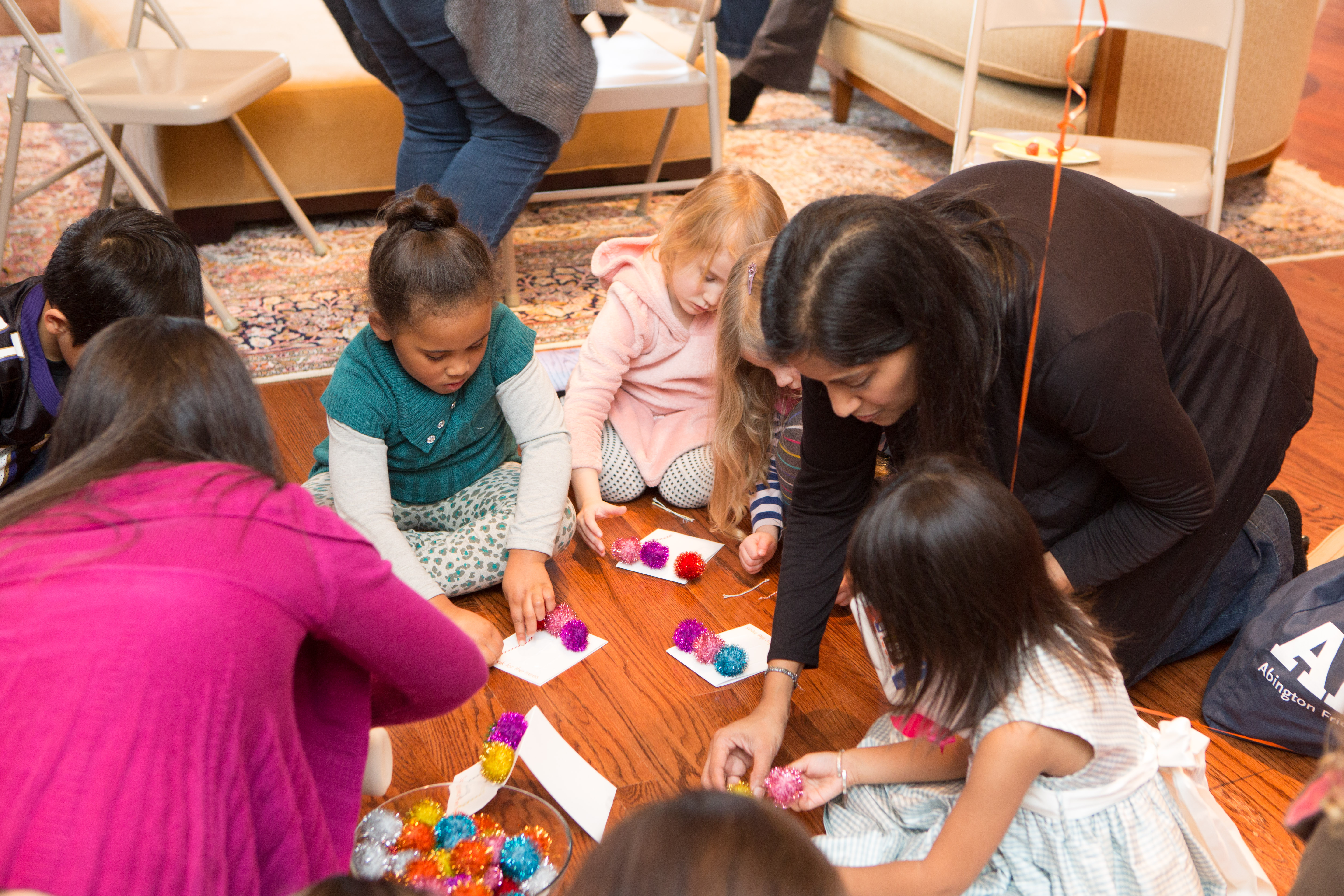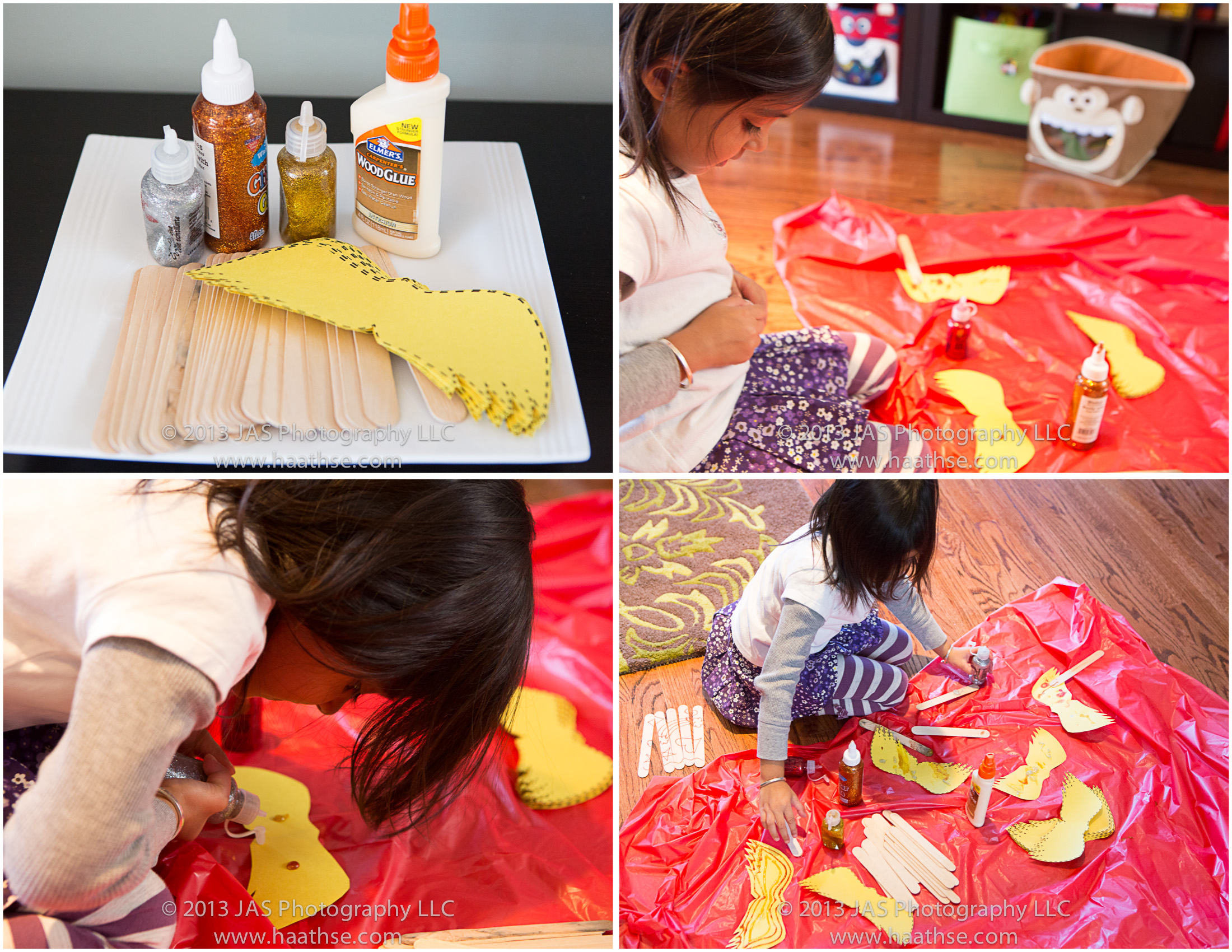 Then I folded them all, and put them out with a ball of fuzzy glitter balls, strips of baker’s twine and glue (don’t have a picture of the set up, but you can kind of see it all in the picture below)