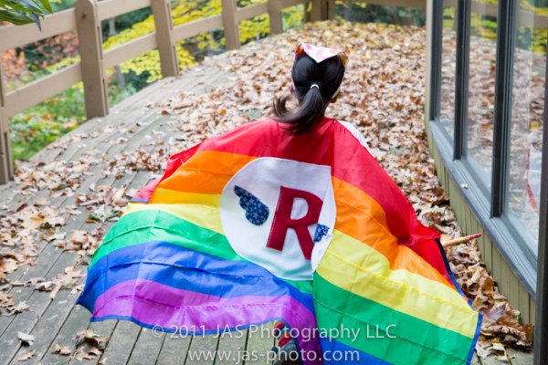 I made a logo for her with “R” (of course!) out of felt and put it in the middle of the cape. Lastly I added fold over elastic in the middle of the top for her to slip it on over her head, and at the top two corners to put her hands through, so that it would spread out when she put her hands up.