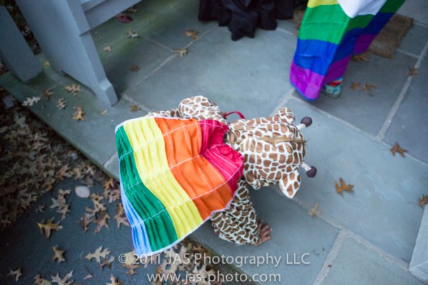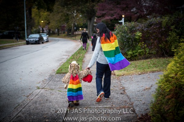 The rainbow bracelets are gay pride bracelets I found online, but they were huge for her tiny wrists. So I cut them and put velcro on the ends to put them on her.