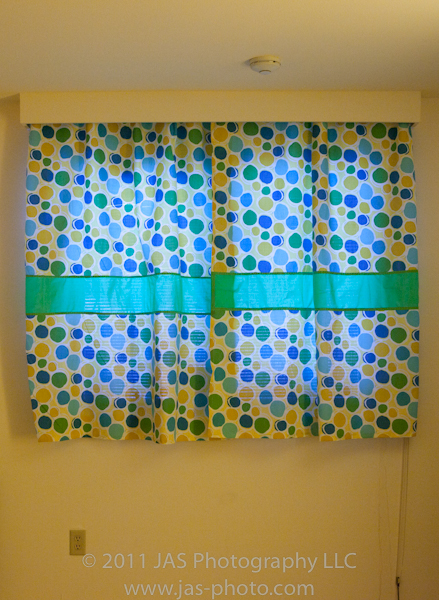 In R’s room, I hope to take down the existing box for the curtain attachments and put up a simple rod – but that will come later. For now, I was able to just use the existing hooks and poke them through the fabric on top. That’s it. I left the top unsewn, and finished, and it is working fine!