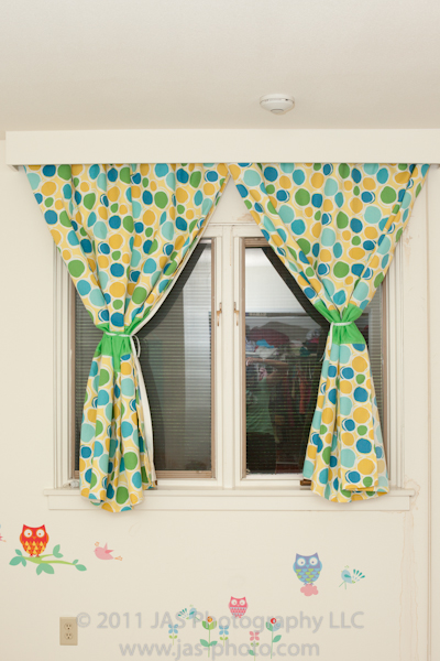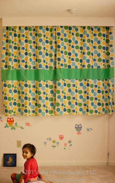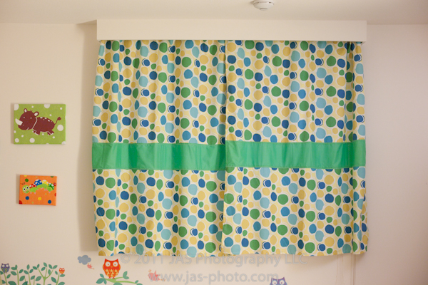I simply sewed the plain green strip to the main fabric pieces (top and bottom), and then hemmed the sides and bottom of each drape. To hem them, I just turned the edges in 1/4 inch and then again another 1/2 inch and sewed a straight stitch down each side. Like I said – I like to keep things SIMPLE. I didn’t even iron them first because I was rushing to get the sewing done before she woke up from her nap.