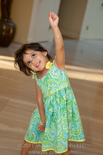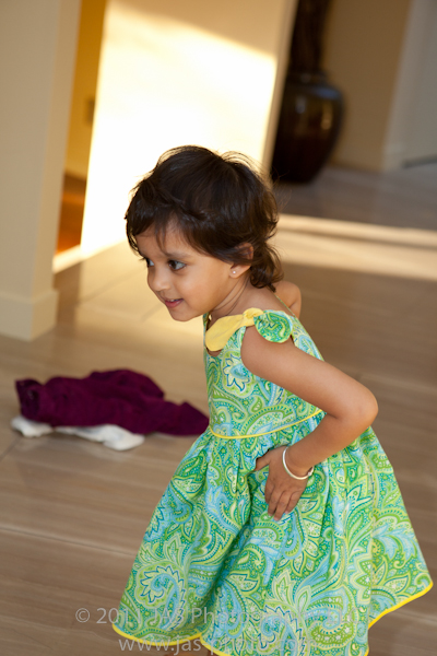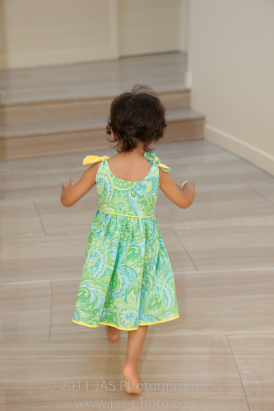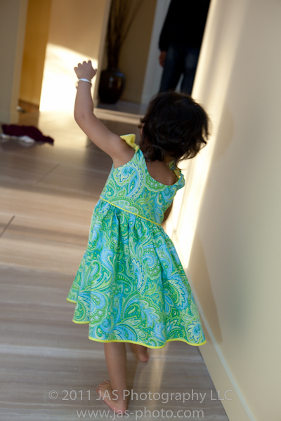 After a lot of protests, I finally got her to put on the dress (correction: I got her undressed for her bath and then slipped the dress over her head before she was the wiser =) and she seemed to have a lot of fun running around in it! In fact, after we finally did give her a bath, she started crying because she wanted to put on the dress instead of her PJs!