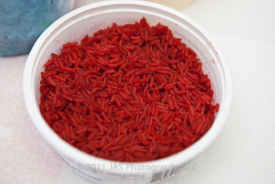 The other day I made colored rice for R to play with in her play kitchen. Her teachers at school said she LOVES table games, and particularly loves their sandbox and table. So, I figured I would make this for her. It actually started off with making art with colored water at school. We tried it a home, and when we had left over water, I decided to through some rice in.
