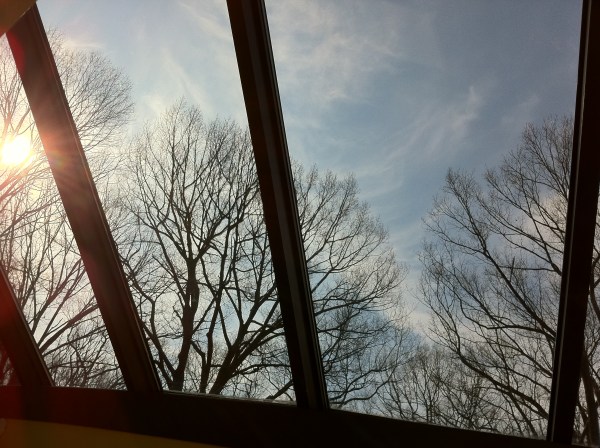 Today, however, I bring you the view of the trees as seen through the rain and snow dripping down the skylights. I like that it looks like a reflection in water…but it is actually a view through water.