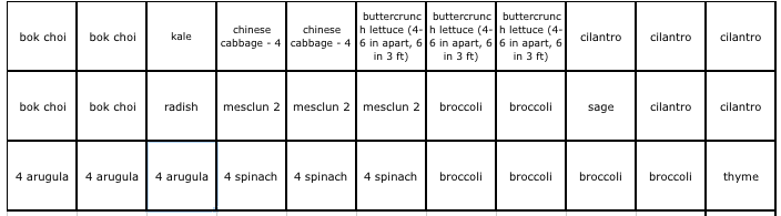 As you can see above, I revised my plan a bit. Given the number of people who agreed that you can crowd lettuce and cabbage if you are harvesting them continuously, I planted the buttercrunch lettuce, mesclun mix and chinese cabbage 4 to a square foot instead of spreading them out more. So these freed up some space in my cool weather bed! I have highlighted in blue the areas that are currently empty with my potential plans. I am off to some nurseries this afternoon to see what other plants/seeds I can find. I have to get it all in within the next few days because starting Monday I am working for 12 days straight – which means very little time for gardening =(