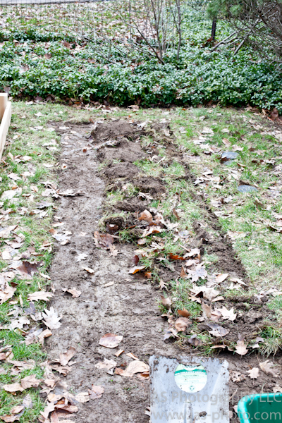 Below you can see the first raised bed area where I started to remove the sod where the bed will sit. It is not easy work! I definitely have a new appreciation for the hard labor that goes into farming! I have a particularly weak core (i.e. my core muscles) and was SO FATIGUED after doing this work. I felt like I couldn’t hold myself up adequately. It was pretty pathetic.