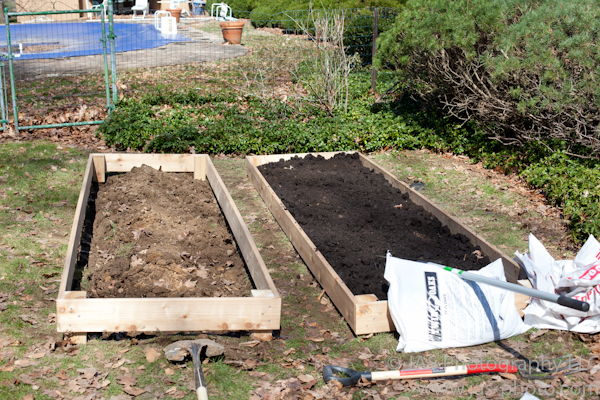 Below you can see one bed finished and ready to plant. Luv (my husband) finished the second bed as well – so they are now both ready to plant! Yay!