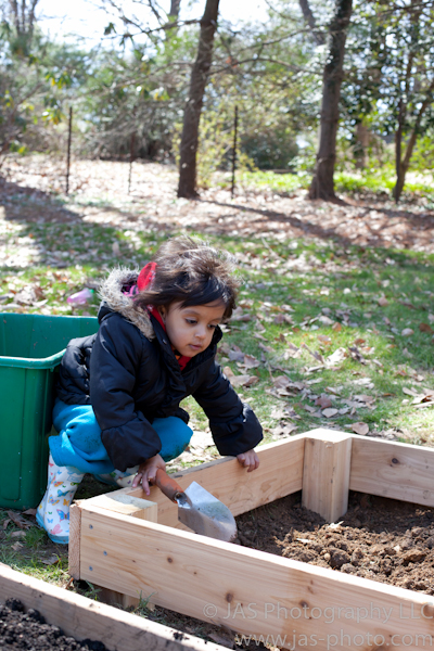 Yesterday I was gifted with warm weather. I walked out with a coat on to plant my little transplants, and was met with a very welcomed wall of warm air. You don’t have to ask me to take of my jacket twice! Miami girl was very happy. So I took Radha out to help me – and we got through about 9 transplants before I could no longer keep her entertained…I guess that is still pretty good! I finished the rest during her nap (thank goodness for baby monitors!) – you can see the results above.